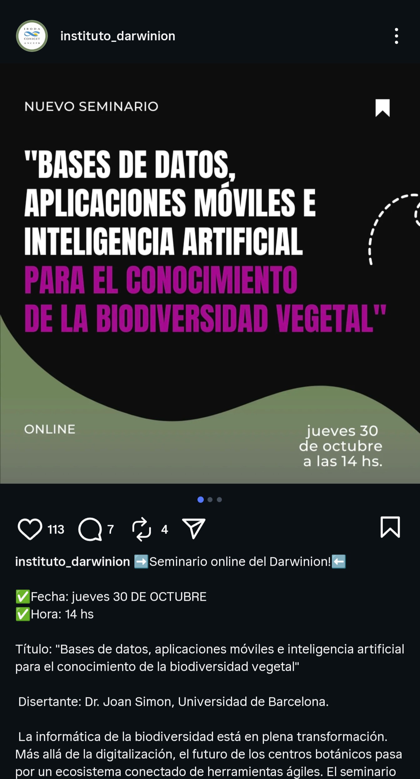 A l'Argentina, el 30 d'octubre va impartir a Buenos Aires el seminari «Bases de datos, aplicaciones móviles e inteligencia artificial para el conocimiento de la biodiversidad vegetal», invitat pel director del Darwinion, el Dr. Raúl Pozner i organitzat per l’Instituto de Botánica Darwinion (CONICET – ANCEFN). La sessió, conduïda en format presencial i també en línia, va permetre compartir l’estat actual de la informàtica de la biodiversitat i reflexionar sobre com les eines digitals —des de les grans bases de dades fins a les aplicacions mòbils i els models d’IA generativa— estan redefinint la manera com accedim, gestionem i integrem el coneixement botànic. Al final vàrem tenir temps de compartir un parell de “demos” per tal de veure les potencialitats de les apps mòbils enriquides amb la IA
