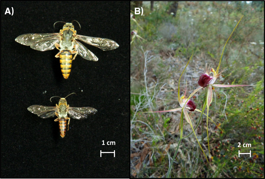 Les formes petites de Macrothynnus insignis (esquerra) pol·linitzen l'orquídia amenaçada Caladenia huegelii (Foto BJLS)