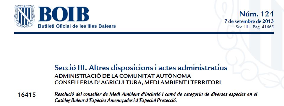 Una nova actualització de la normativa balear de protecció d'espècies per resolució del conseller de Medi Ambient, d’inclusió i canvi de categoria de diverses espècies (BOIB 124 de 7 de setembre de 2013).
